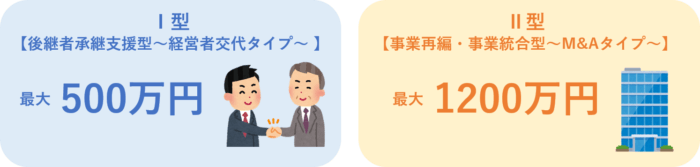 事業承継補助金を申請する際は、最大500万円までとなるⅠ型と、最大1200万円までとなるⅡ型の2種類から、どちらか1つを選択する必要があります。Ⅰ型は(後継者承継支援型~経営者交代タイプ~)、Ⅱ型は(事業再編・事業統合型~M&Aタイプ~)と整理され、事業承継の形態と事業承継の取り組み内容によってことなります。